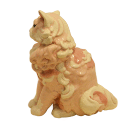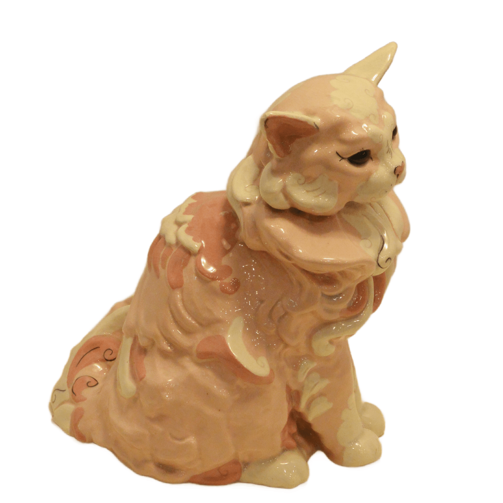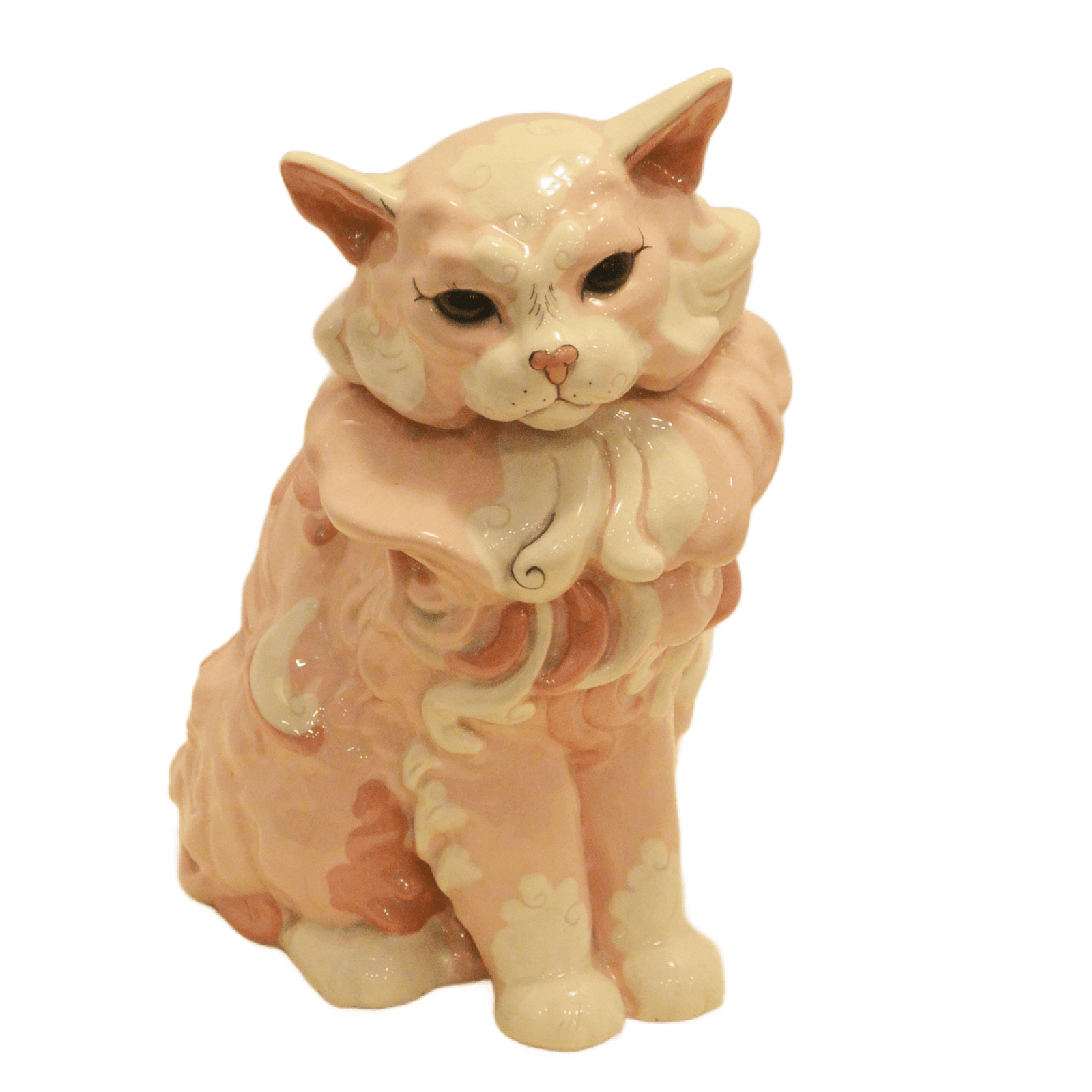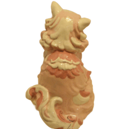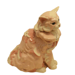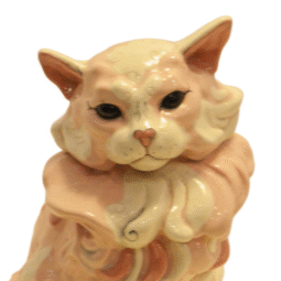 This fabulous Cat is a dramatic example of Kay Finch’s artistic talent and creative whimsy. As one of her larger pieces, it is done in an enchantingly romantic mix of soft pink, dusty rose, black and cream. There are numerous hand painted touches from her nose to her highly detailed toes. Just look at those eyes!
