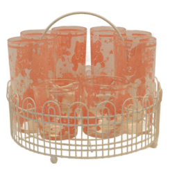 It includes 6, 6″ tall tumbler glasses and 2, 3 1/4″ scotch (or double shot) glasses, a wire carrying rack and a wonderful, matching tip tray.