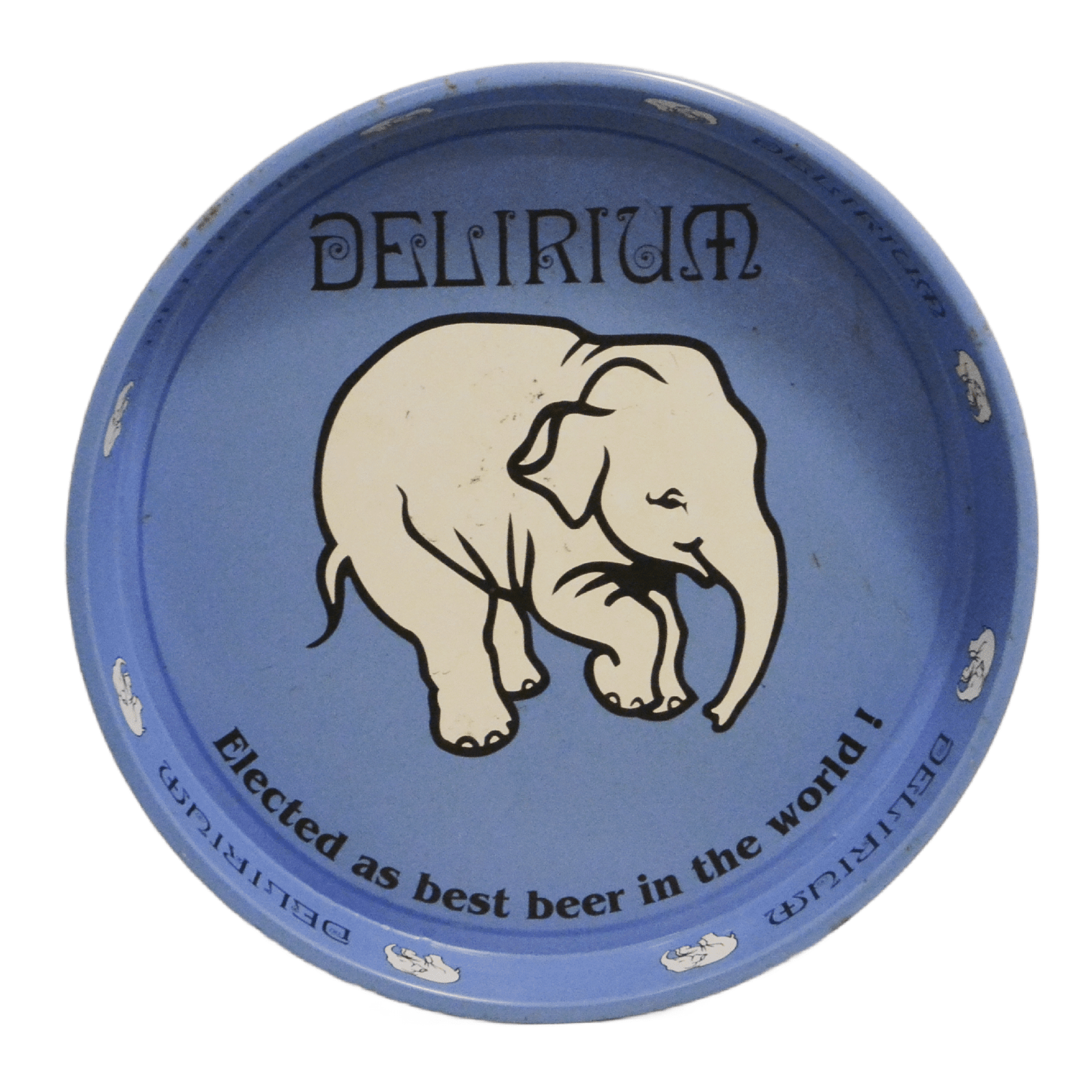 The actual logo of this brewery, also known as the “Brewery of the Pink Elephant”,  was a pink elephant on a blue tray. So to see a Delirium tray with a white elephant is very unusual.