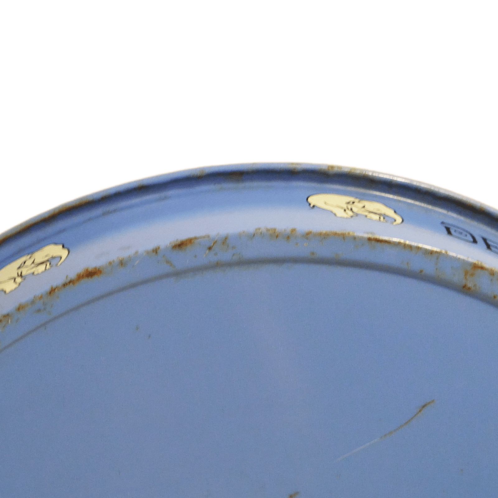 This circular tray measures 14″ across and it is 2″ deep. On the front it is in near perfect condition, with only a few slight marks on the elephant. The bottom does show signs of its age, with some rust in spots along the bottom rim, and some scratching on the underside. This does not affect its beauty as a display piece, or its use to carry glasses or bottles of your favorite beer.