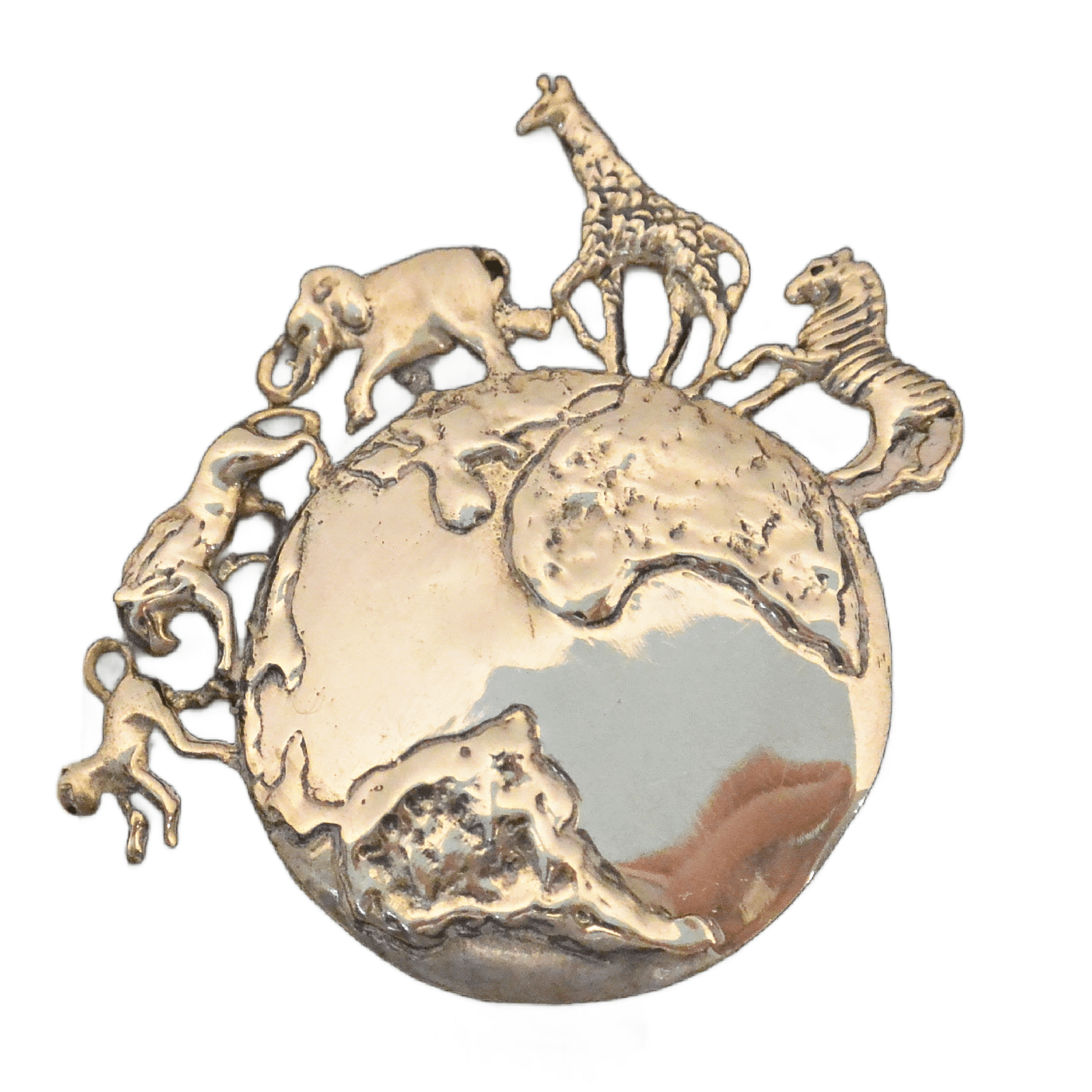 This stunning vintage sterling silver brooch features a parade of animals moving across a world globe.